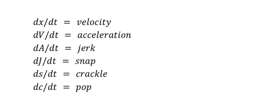 We can go on and on this way. The derivative of acceleration is how quickly/slowly the object is getting faster/slower, and it is called jerk. You can think of it by imagining yourself on a rollercoaster. If the rollercoaster speeds up gradually, it feels smoother than if it suddenly speeds up very quickly (where you would feel a jerk.)